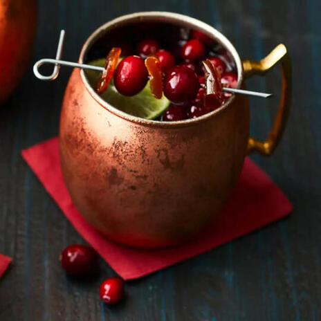 An Autumnal spin on a Garlemald mule. Vodka, cranberry, and lime served over frozen cranberries, topped with ginger beer, and garnished with a kebab of cranberries and candied ginger.